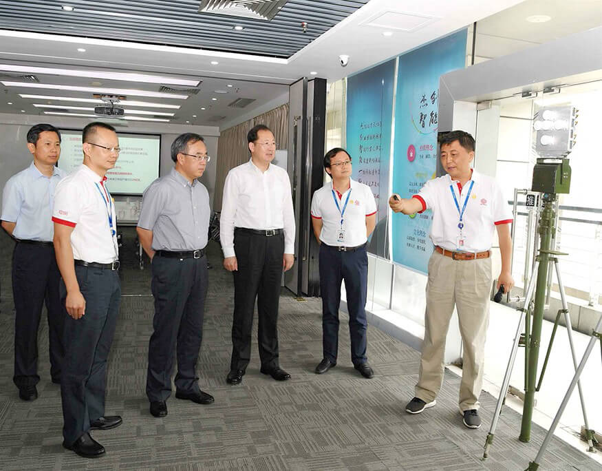 今年会jiannianhui智能研发中心总经理朱勇杰为胡春华书记一行介绍公司产品