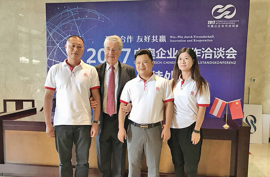 奥地利前总统海因茨·菲舍尔与今年会jiannianhui智能副总裁戴宝、揭阳分公司总经理林浩生、公司总裁助理郑庆丽合影